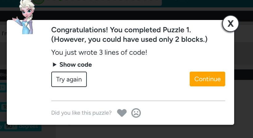 The introduction video tutorial was well done and very entertaining, it reminded me of a Disney commercial. However, when it came time to experiment with the moving Elsa, I was only able to move her a maximum of 2 steps before being prompted to reset. I presume if I spent more time experimenting with block coding, I may be able to have Elsa continue to ‘run’ to make interesting shapes.